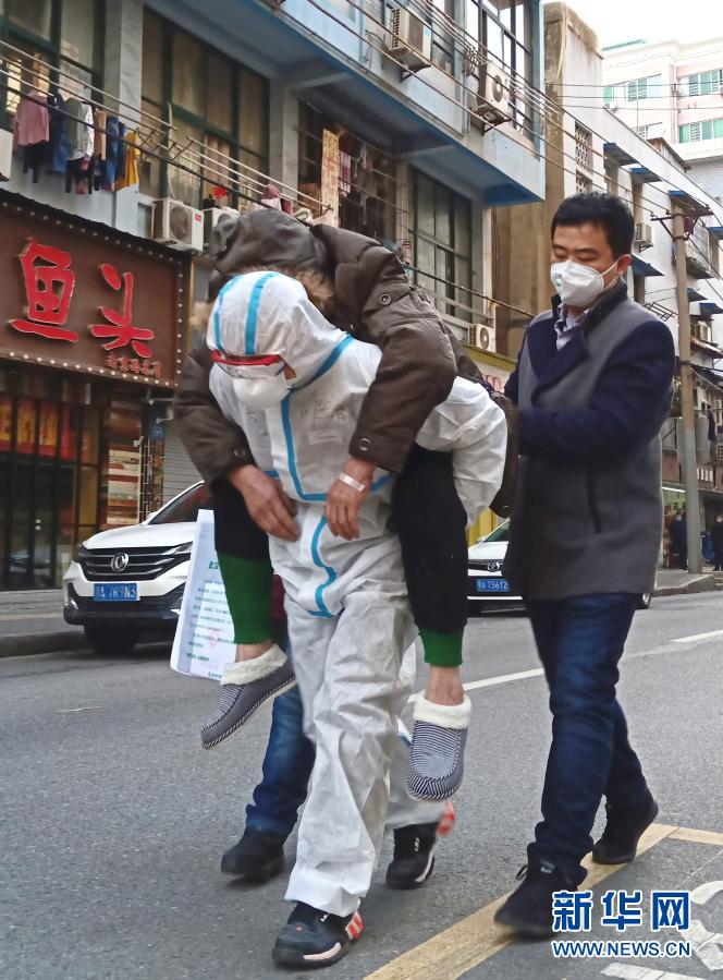 2020年1月30日,武汉市江岸区大智街派出所民警邵玉春背着病患准备送医。