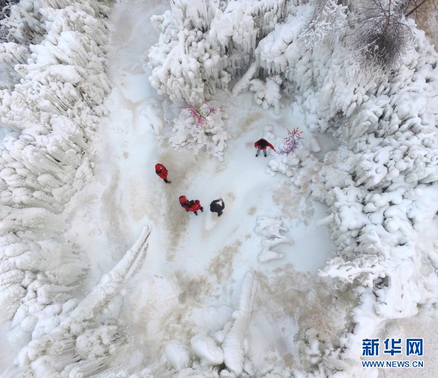 1月9日,游客在白桦林景区欣赏冰瀑(无人机拍摄)。新华社发(史有东 摄)