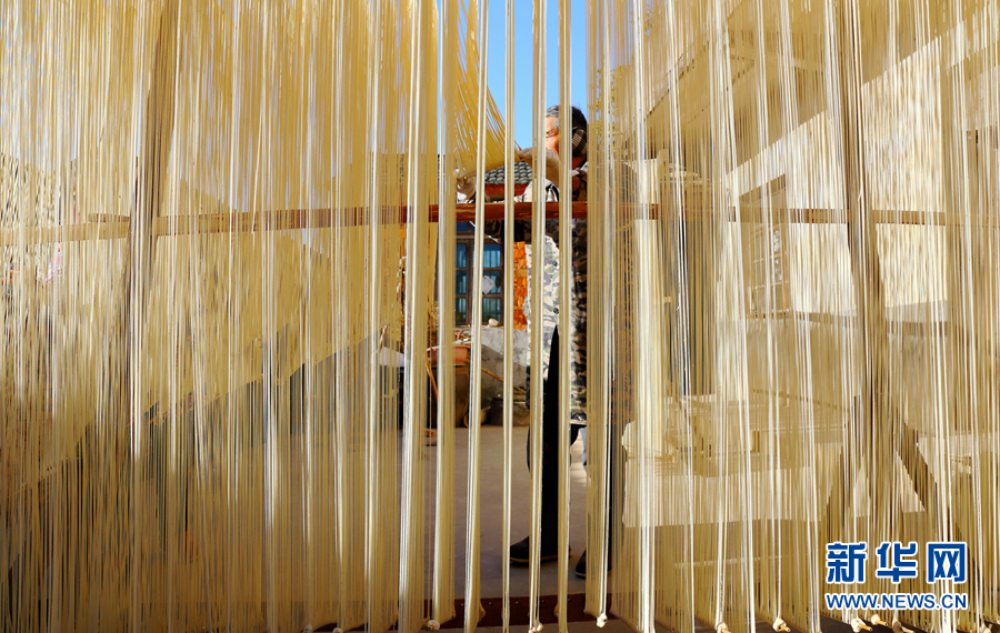 1月8日,安徽省合肥市庐江县泥河镇洋河村村民在晾晒手工挂面。新华网发(王闽 摄)