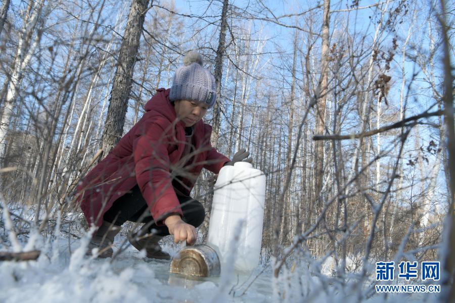 在大兴安岭林业集团公司呼中林业局大西沟管护区作业点,负责做饭的森林抚育工人从河边凿冰取水(1月9日摄)。