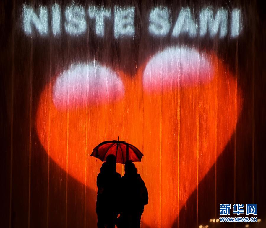 1月2日,在克罗地亚萨格勒布,人们站在投射有“你们不孤单”字样的喷泉前。