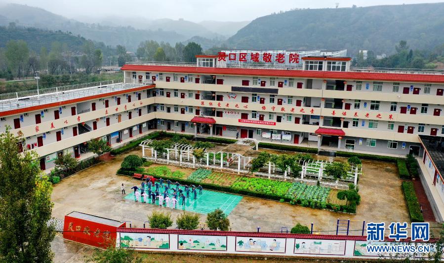 灵口区域敬老院的老人们在工作人员的带领下做操(2019年10月15日摄,无人机照片)。