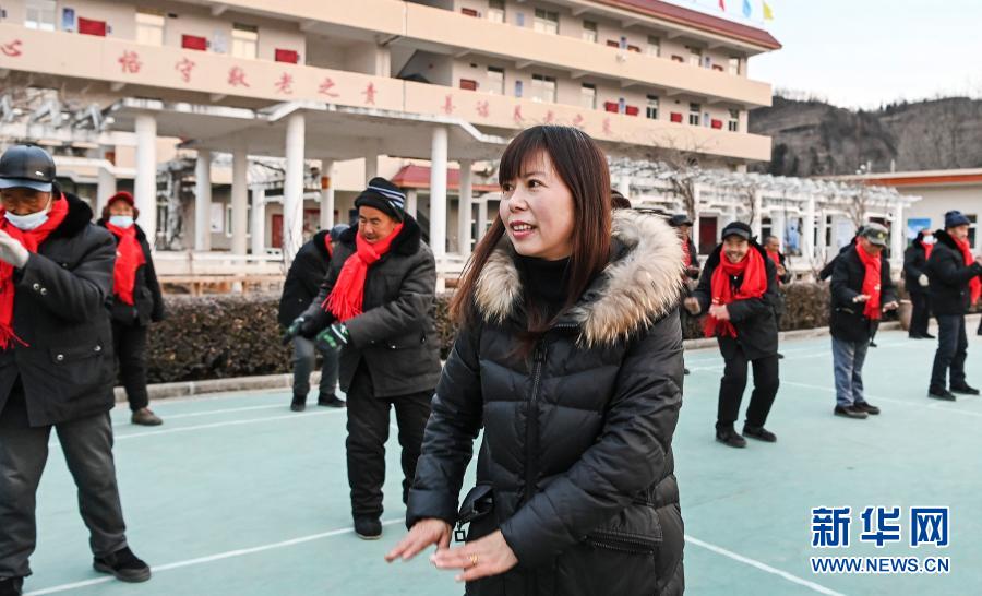 王育苗(前)带领老人们进行户外活动(1月7日摄)。