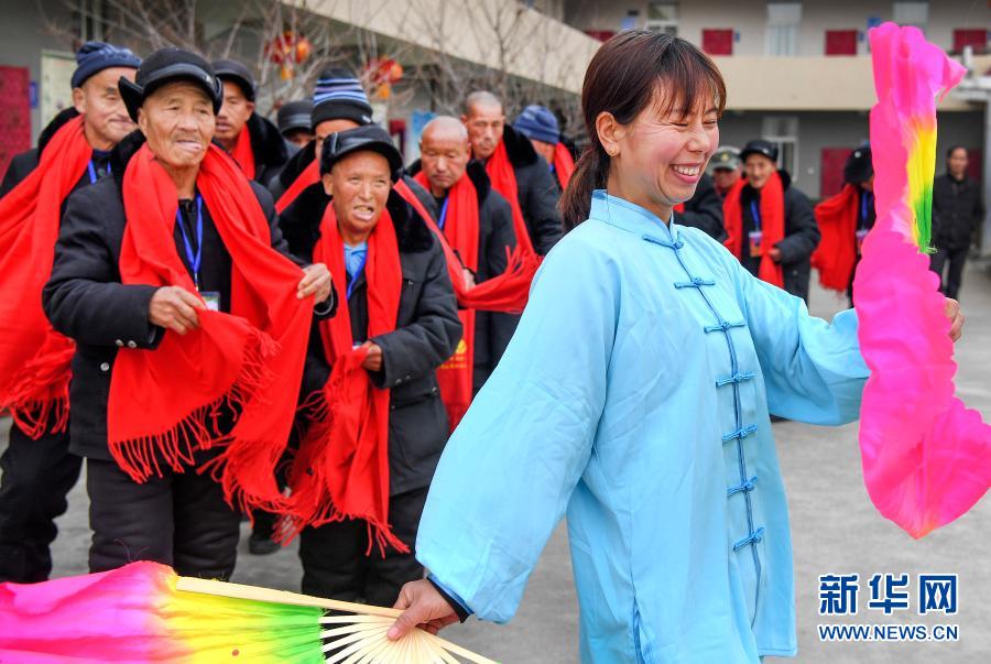 王育苗(前)和老人们一起扭秧歌(2020年1月18日摄)。