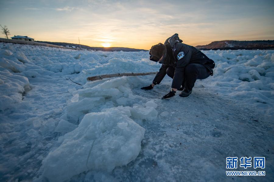 2021年1月9日,史先强在洛古河村旁封冻的黑龙江面上查看是否有偷捕者的暗网。