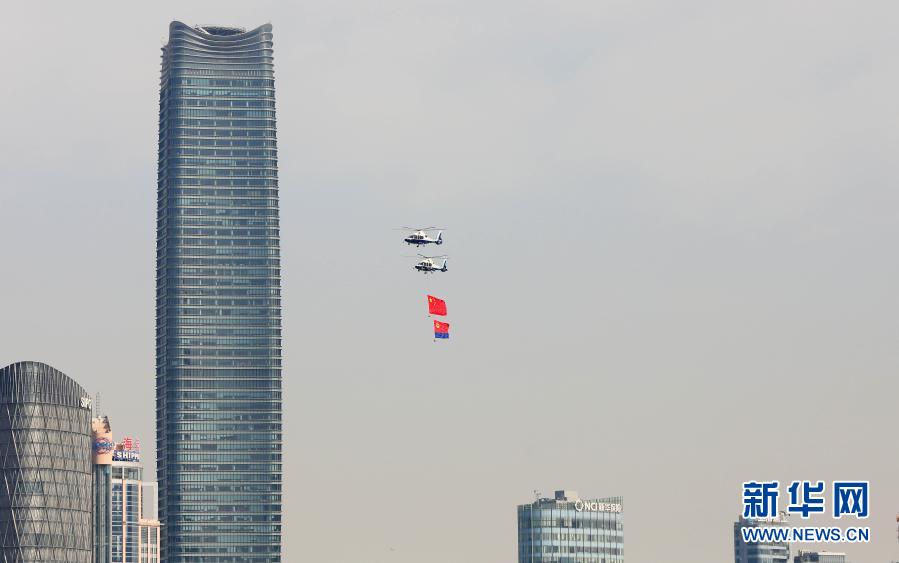 1月10日,两架悬挂国旗和警旗的警航直升机从上海白玉兰广场大楼旁飞过。