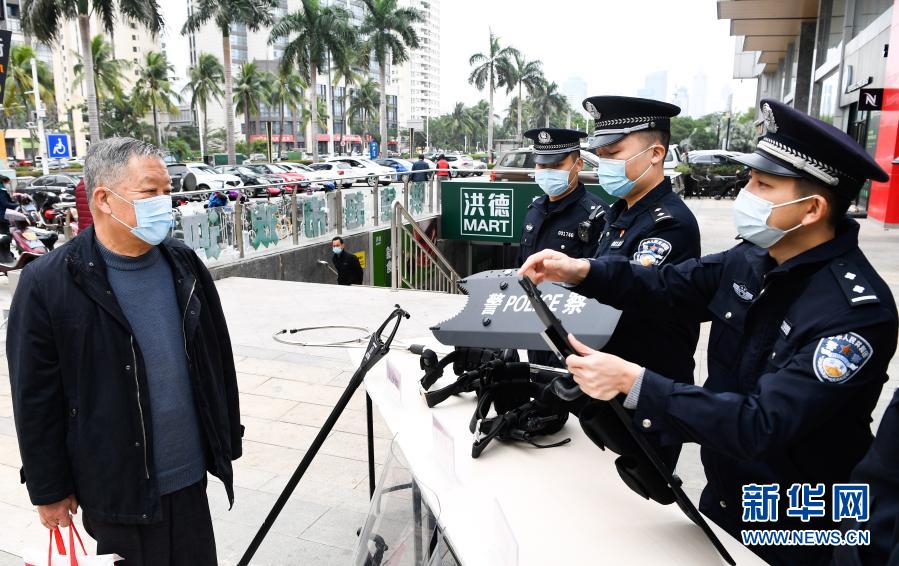 1月10日,海口长堤海岸派出所的民警向市民介绍警务装备。