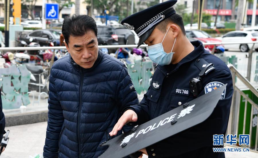 1月10日,海口长堤海岸派出所的民警向市民介绍警务装备。