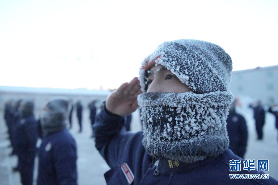 1月10日,在大兴安岭地区呼中区,黑龙江省森林消防总队大兴安岭地区支队呼中大队的消防员在敬礼。