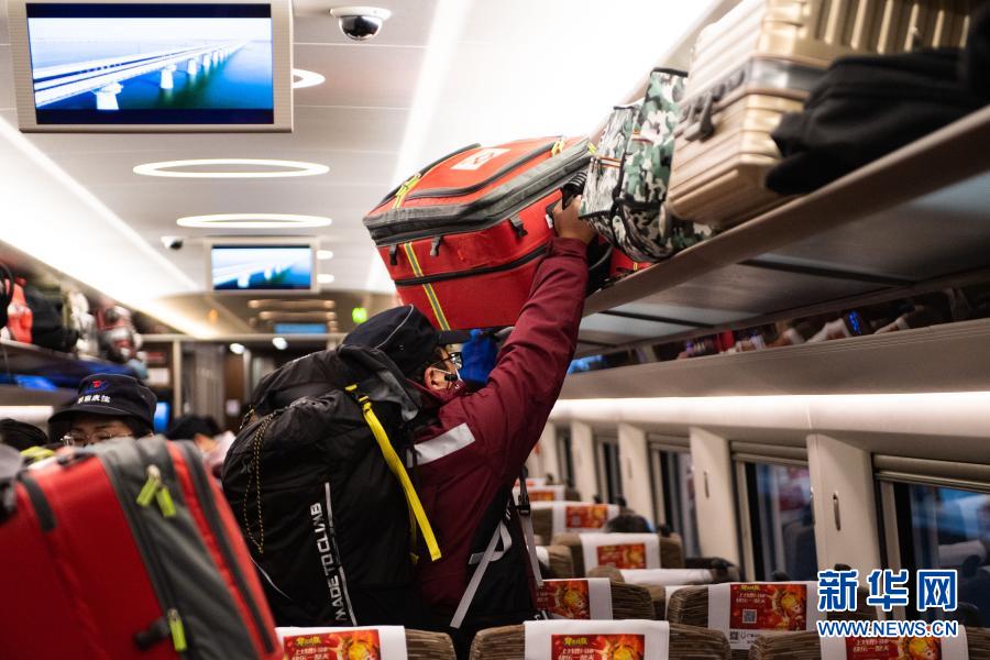1月10日,在G80次列车上,医务人员在摆放行李。