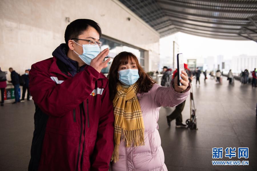 1月10日,在长沙南站,医务人员和亲友道别。
