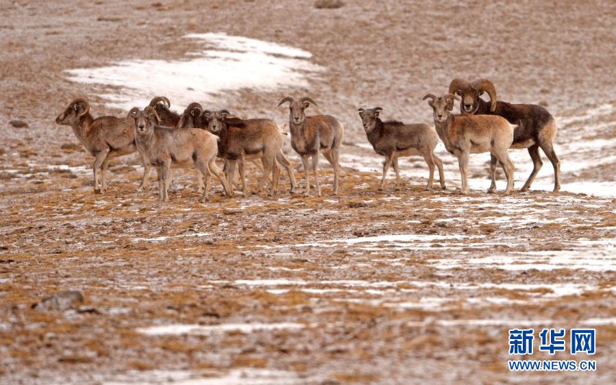 1月9日,盘羊在阿克塞哈萨克族自治县阿勒腾乡哈尔腾草原上活动。