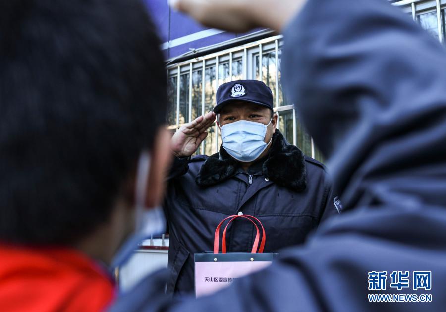 1月10日,在位于乌鲁木齐市红山东路的天山255便民警务站前,辖区小朋友刘星向警务站站长张鹏敬礼。