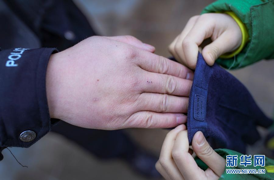 1月10日,在位于乌鲁木齐市红山东路的天山255便民警务站前,辖区居民慰问民警,小朋友范沛霖为警务站副站长佟舒海戴上赠送的手套。