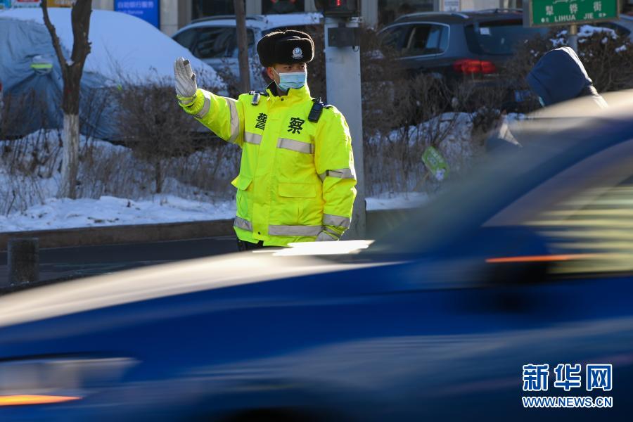 1月10日,在乌鲁木齐市劳动街路口,水磨沟区交警大队南湖路中队的中队长胡龙在寒风中上岗执勤。