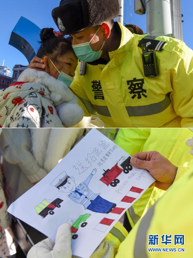 拼版照片。上图:1月10日,在乌鲁木齐市公安局交警支队开展的“你好,警察节”直播活动中,水磨沟区交警大队南湖路中队中队长胡龙的女儿(左)为其送上节日祝福。下图:1月10日,水磨沟区交警大队南湖路中队中队长胡龙收到女儿的节日礼物。