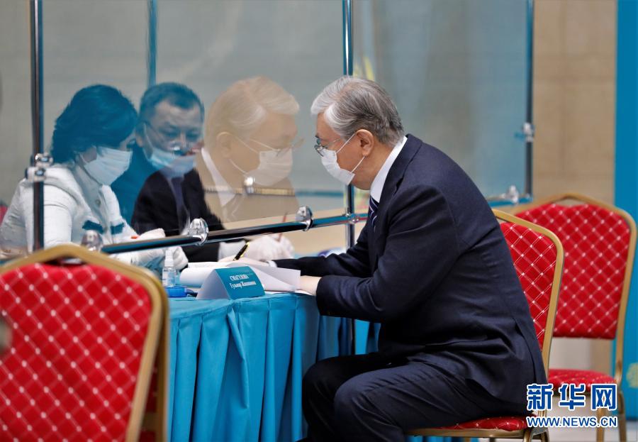 1月10日,哈萨克斯坦总统托卡耶夫在首都努尔苏丹参加议会下院选举投票前签署文件。