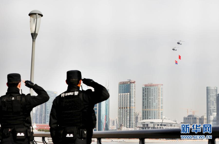 1月10日,在上海外滩执勤的两名特警向警航直升机悬挂的国旗和警旗敬礼。