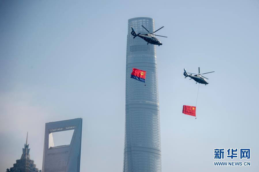 1月10日,两架悬挂国旗和警旗的警航直升机从黄浦江上飞过。