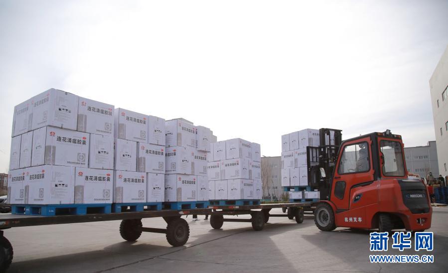 1月10日,在石家庄以岭药业股份有限公司制剂车间,工人将连花清瘟胶囊搬运出库。