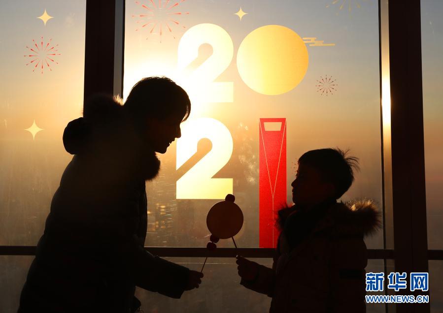 2021年1月1日,小朋友和妈妈一起在上海环球金融中心100层观光厅迎接新年日出。