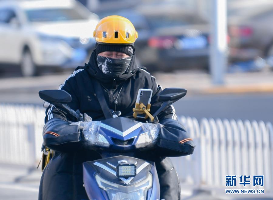 1月6日,在天津市河东区街头,外卖员在寒风中送餐。