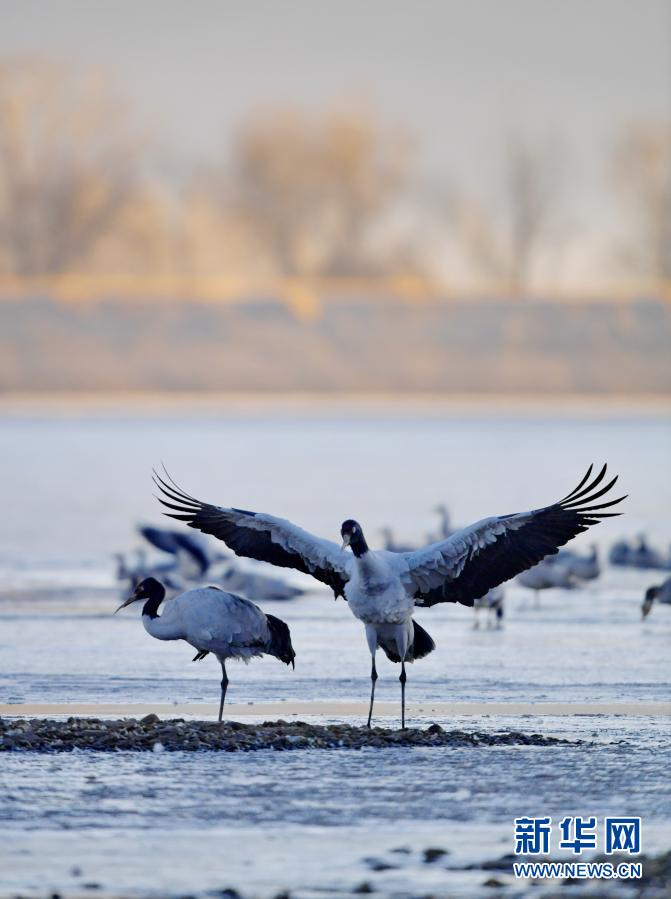 在西藏拉萨市林周县卡孜水库栖息的黑颈鹤(2021年1月3日摄)。