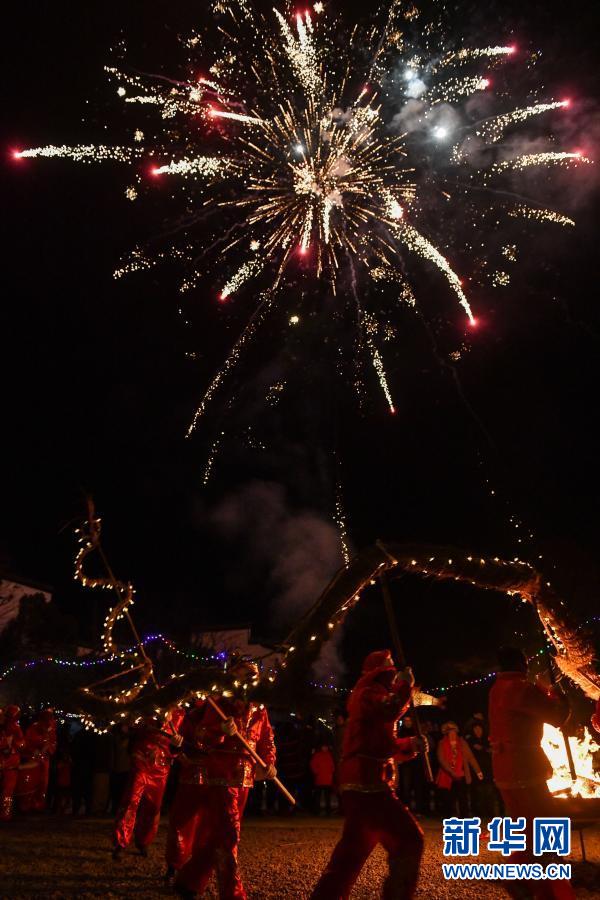 2021年1月2日,村民在安徽省黄山市徽州区西溪南镇表演舞草龙。