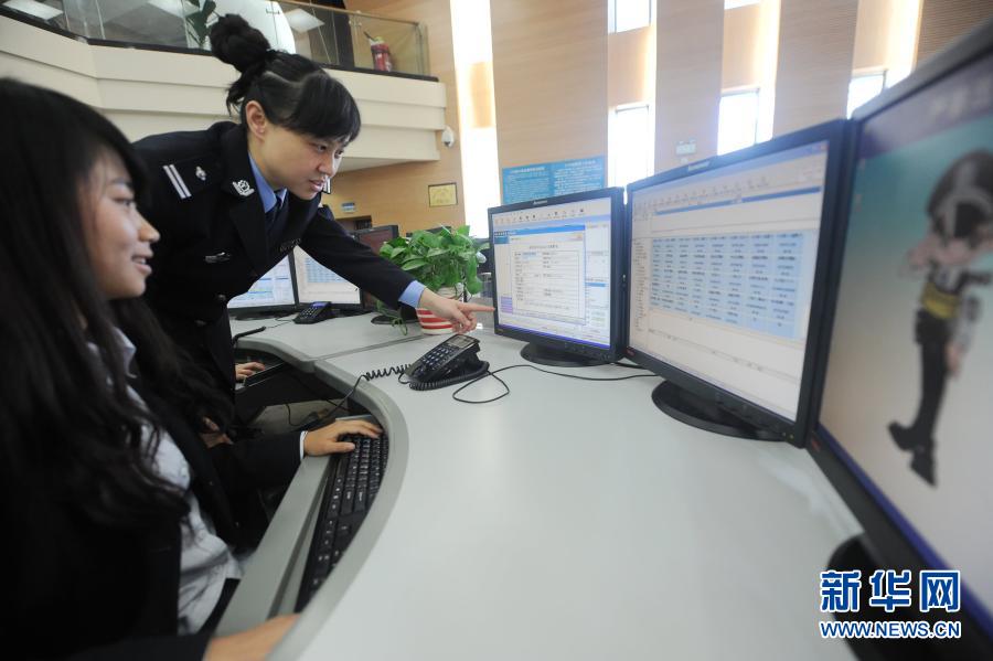 徐燕(右)在指导新来的110接警员开展工作(2012年10月23日摄)。