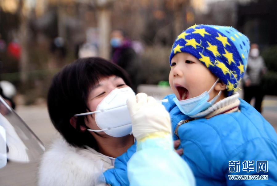 1月10日,在石家庄市裕华区天海誉天下小区,小朋友在接受核酸采样。