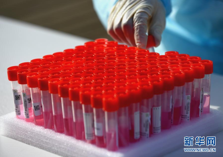 1月10日,在石家庄市裕华区天海誉天下小区,医护人员在摆放核酸检测样本。
