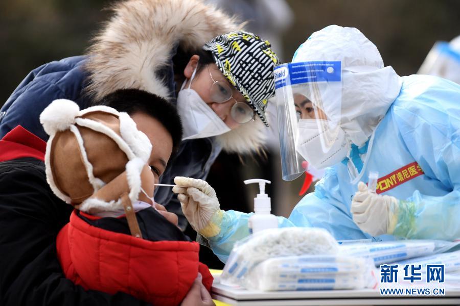 1月10日,在石家庄市裕华区天海誉天下小区,医护人员为居民进行核酸采样。