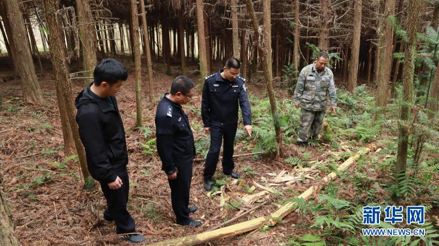 郭晓强(右二)在盗伐林木案件现场分析作案动机(2020年12月11日摄)。