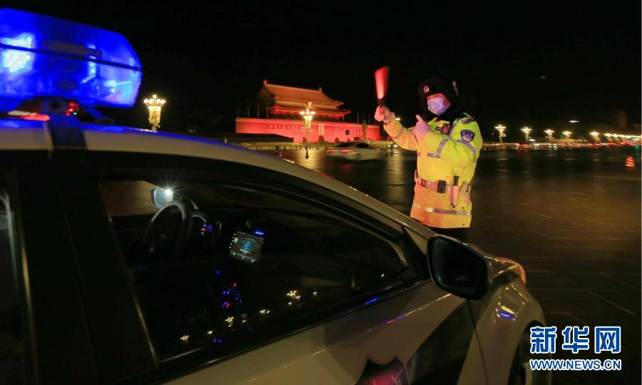 1月10日凌晨,北京市公安局公安交通管理局东城交通支队的交警在长安街指挥交通。