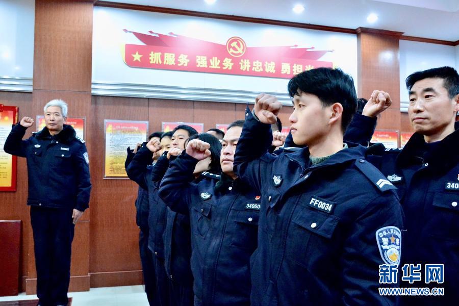 1月10日,安徽省淮北市中级人民法院法警在重温入警誓词。