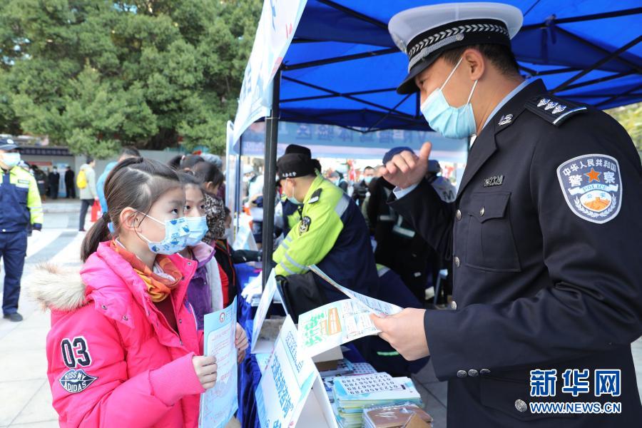 1月10日,在警营开放日活动现场,交警向小朋友讲解交通安全知识。