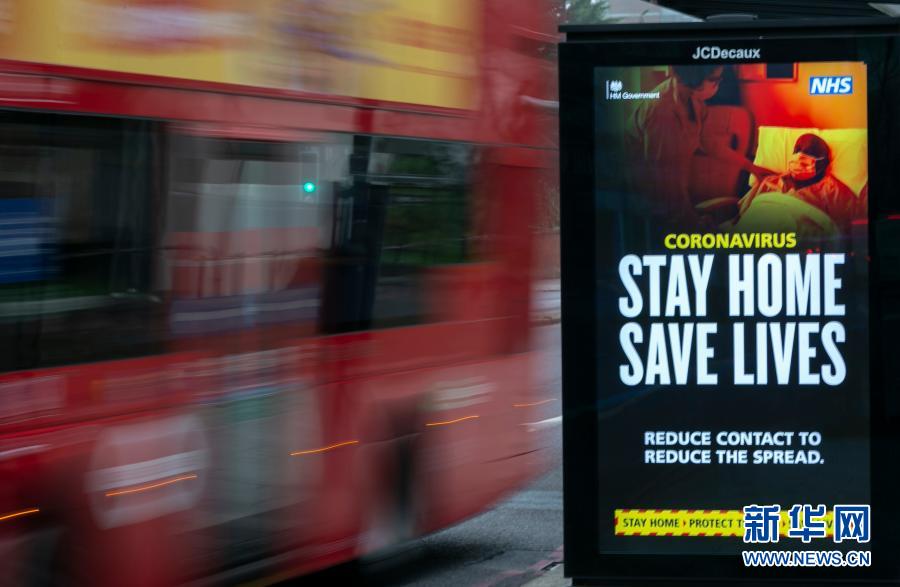 1月10日,一辆公交车驶过英国伦敦一处公交车站,广告牌上显示英国疫情防控新口号——“留在家中,挽救生命”。