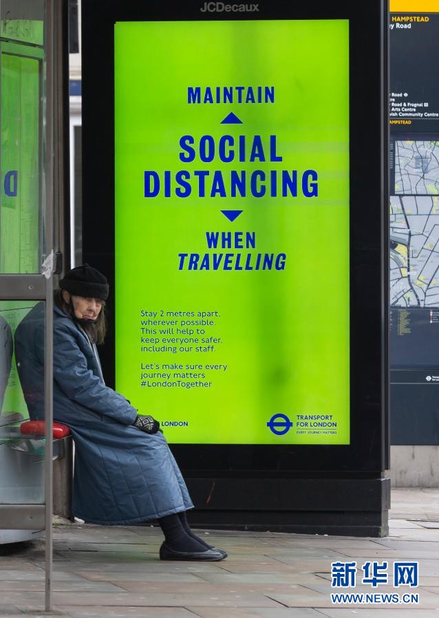 1月10日,一名乘客在英国伦敦一处公交车站等车,广告牌上显示“旅途中请保持社交距离”的提示。