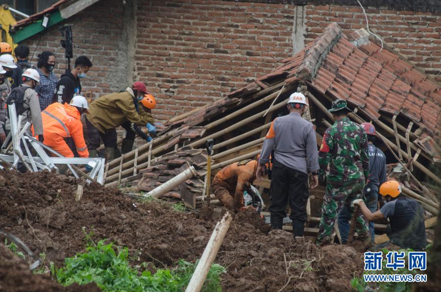 1月10日,在印度尼西亚西爪哇省双木丹县,救援人员在废墟中寻找山体滑坡事故幸存者。