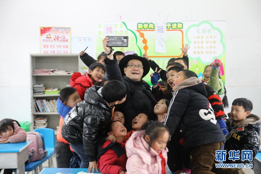 2020年12月17日,植国明在大湾小学和孩子们自拍。新华社记者 曹力摄