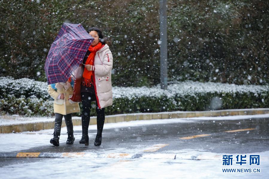 1月11日,在贵阳市观山湖区,市民雪中送孩子去幼儿园。