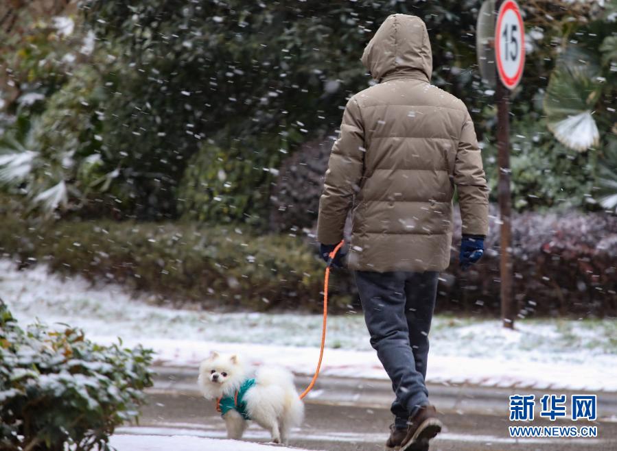 1月11日,在贵阳市观山湖区一小区内,市民牵着小狗在雪中散步。新华社记者 刘续 摄