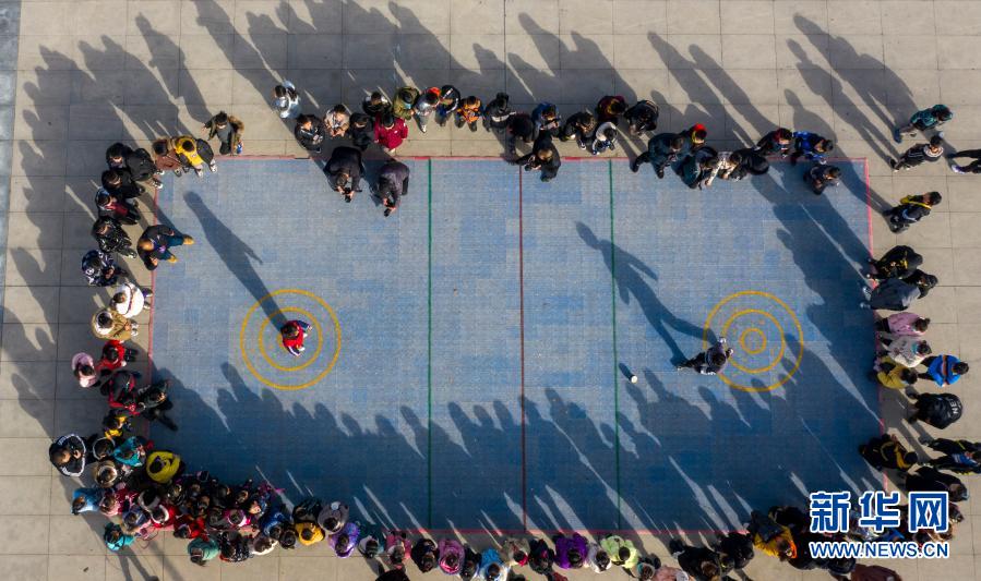 1月11日,河南省济源市梨林镇中心小学的学生在校园进行足螺比赛(无人机照片)。