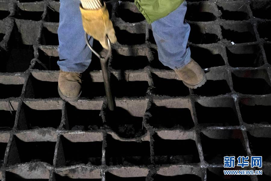 1月10日,在抚远市新世纪热电有限责任公司工区内,李显军使用钎子疏通堵在上煤口的燃煤。