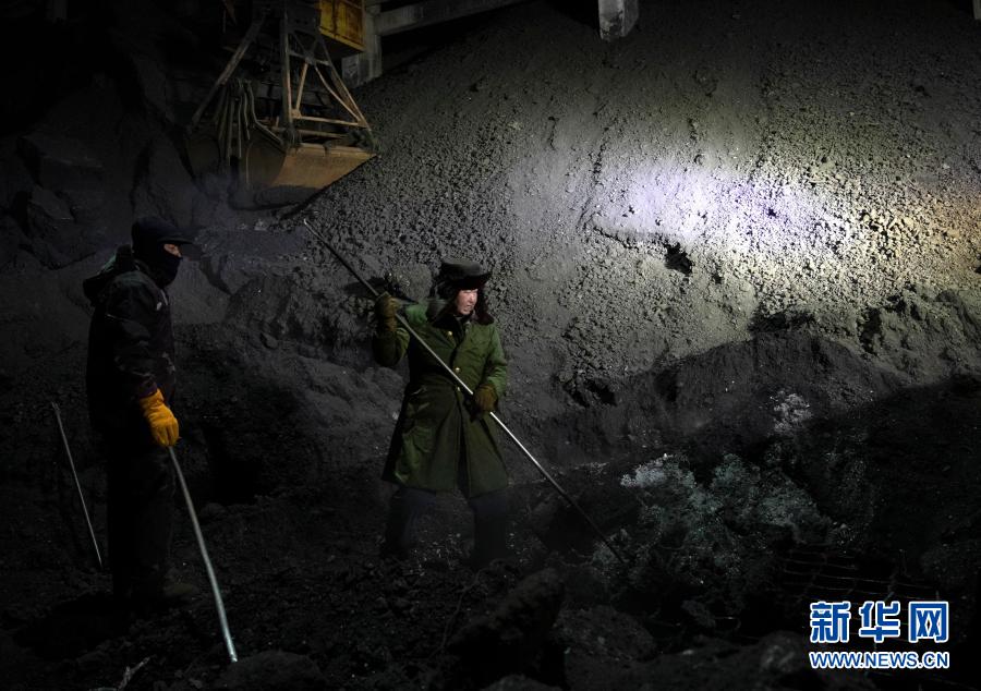 1月10日,在抚远市新世纪热电有限责任公司工区内,李显军(右)和工友进行上煤作业。