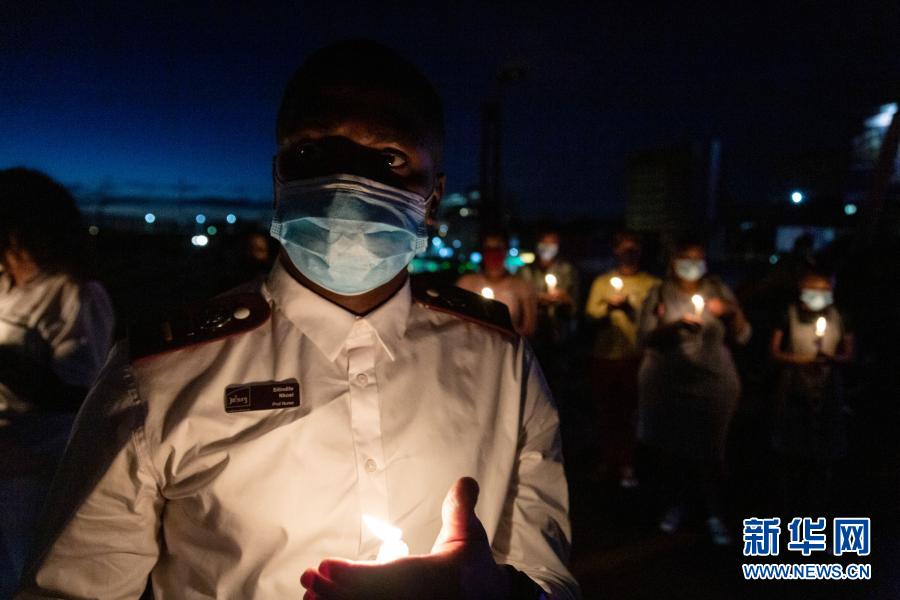 这张2020年12月31日晚拍摄的资料照片显示,在南非约翰内斯堡,医护人员参加烛光守夜活动。