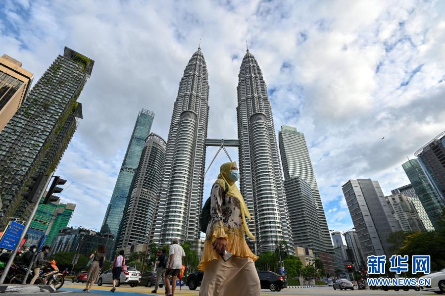 1月11日,在马来西亚吉隆坡,一名女子戴着口罩从马来西亚国家石油公司双塔旁走过。