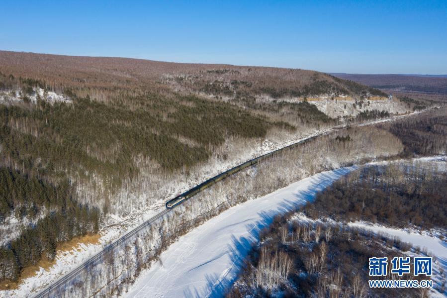 1月11日,一列火车在嫩林线上行驶(无人机照片)。
