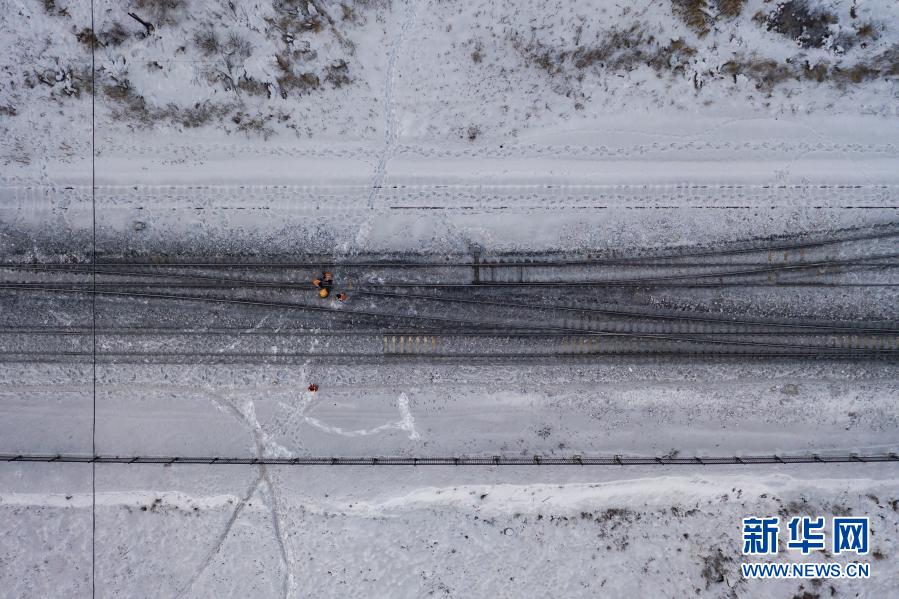 1月11日,漠河道岔维修工队工长杨玉海和工友对漠河站的道岔进行养护作业(无人机照片)。  新华社记者 谢剑飞 摄