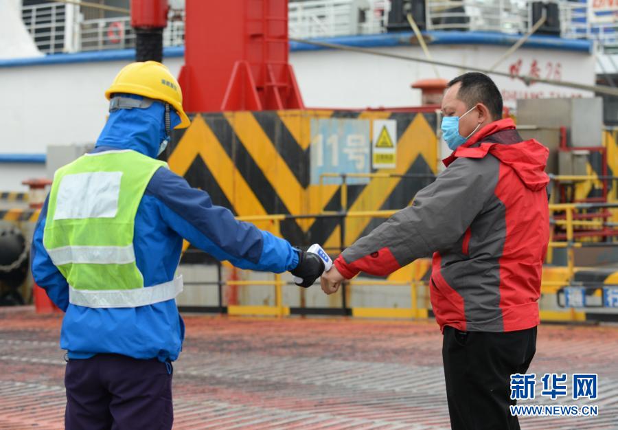 1月11日,在海南海口新海港,船员为乘船旅客检测体温。